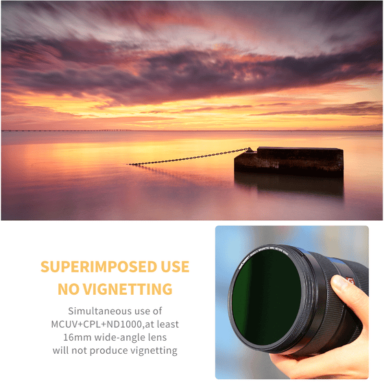 • No Vignetting & Dark Corner - For the filter designed with ultra wide-angle design, the ultra slim frame only 7.4mm, supporting in 16mm telephoto and wide angle lens no vignetting , due to the different in lens type and focal length so this filter might be met dark "X" cross , this isn't quality problem , it can disappear via rotating the filter.